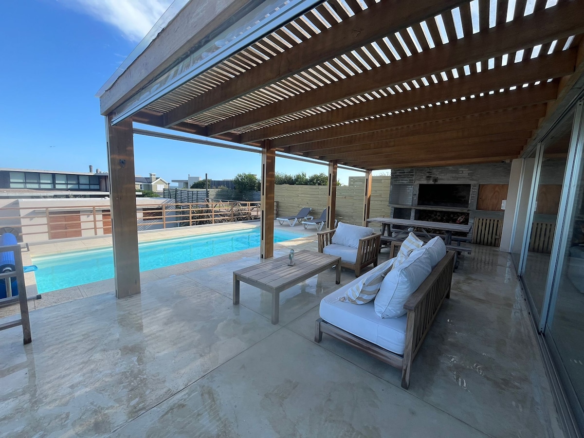 Beautiful 2-story house facing the ocean, an excellent heated pool with waterfall. In total there are 3 bedrooms, 2 bathrooms, 1 en suite with a queen bed, and in the barbecue it has a sofa bed that serves as a service unit. 3 air conditioning units. Closed barbecue with full bathroom. Complete crockery for 12 people. Close to Manantiales, La Barra, José Ignacio and more. Covered garage for 2 cars Electricity and water costs are charged separately, they are minimal. They are taken by meter.