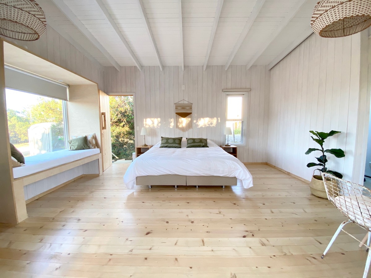 Relajate en este espacio tranquilo a metros del mar y la laguna de José Ignacio. Hermosa casita de un ambiente cerca del pueblo de José Ignacio y sus playas. Te va a encantar por el estilo y comodidad. Es ideal para parejas, amigos o aventureros solitarios, ya que podemos prepararla con cama king size o individuales, pudiendo alojar hasta 3 personas. La casita se encuentra en un predio natural de 450 m2 que comparte con otras 2 casas iguales, siendo las 3 independientes.
