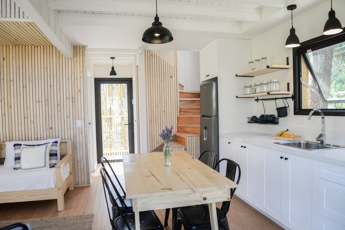 Enjoy the lovely setting of this unique spot in nature. Built of eucalyptus and glass, this tiny home is for you to enjoy the forest, birds, flowers, and tranquility. Located at walking distance from the beach ( Montoya Beach and La posta del Cangrejo Beach) and from the cozy La Barra downtown, this place seems like far away but it is not. A queen bed, a kitchenette, a full bathroom and a comfy living room is what you will find when arriving to this loft. You will not regret this experience!