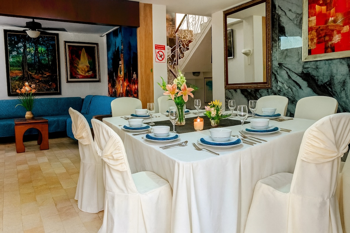The property is fully equipped with AC, fast wifi, Netflix, premium channels, Alexa, board games & toys. Also washer & dryer in a cozy patio & a garden in the garage to relax. Although this is a tranquile neighborhood, the house has 3 (outside) cameras. Huancavilca Norte offers taxi service, restaurants, bakeries, grocery/bodegas, barbershops, dental clinics, liquor store etc. Samanes Park is 14 minutes by foot & Mall del Norte is 10.