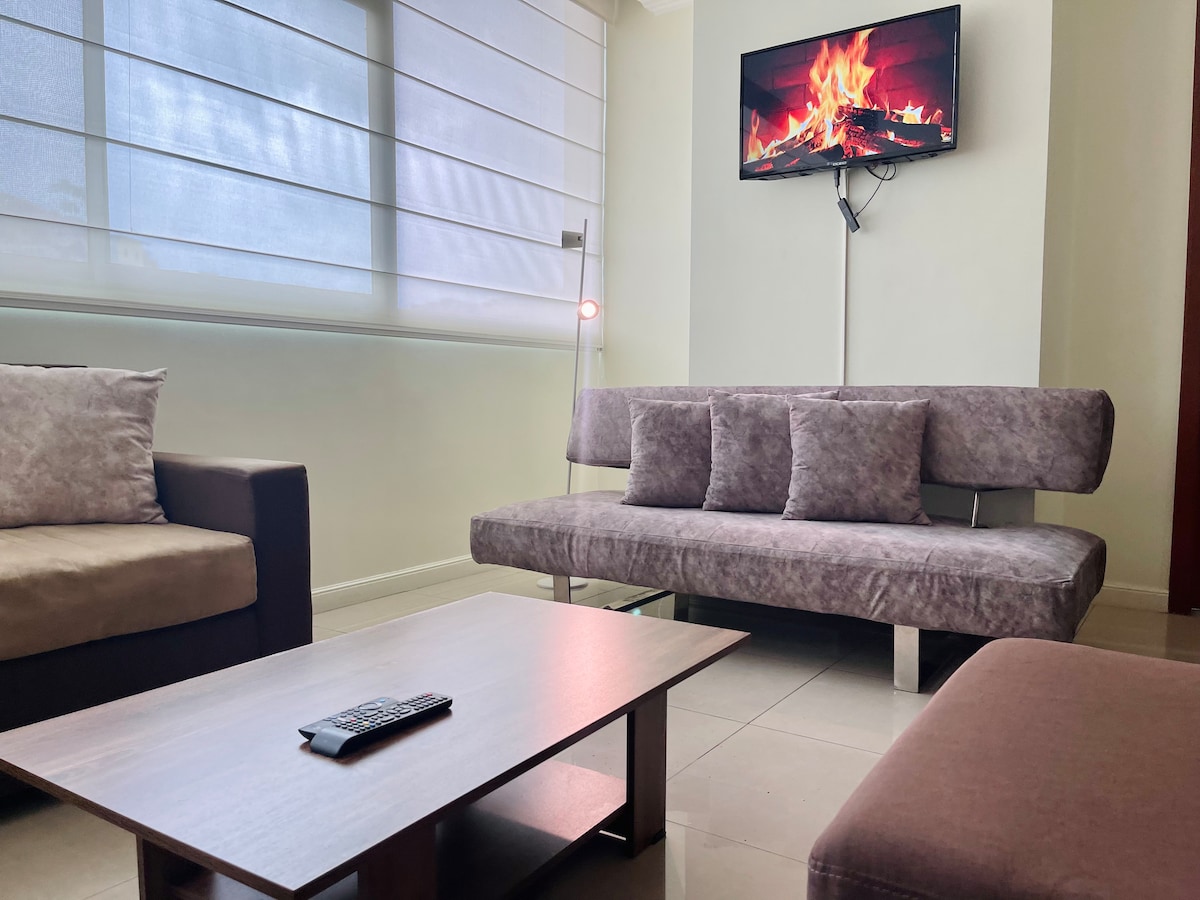🏡 SAFEST AREA IN GUAYAQUIL - ELEGANT APT IN PUERTO SANTA ANA | WIFI (1GB) + PARKING | RIVERFRONT 2 ✨ Feel at home 👤 7 guests · 🛏️ 2 bedrooms · 🛌 3 beds + 2 🛋️ sofa beds + air mattress 🚗 Parking 🏊 Pool, gym and jacuzzi 📍 Next to the Guayas River, near Malecón 2000 and Las Peñas 📶 Wi-Fi (1 GB) · 📺 Netflix 🧺 Hair dryer, iron/board, washer/dryer and fully equipped kitchen ☕ Water, coffee, tea, salt, sugar and amenities (subject to availability) ✨ Ideal for rest or remote work