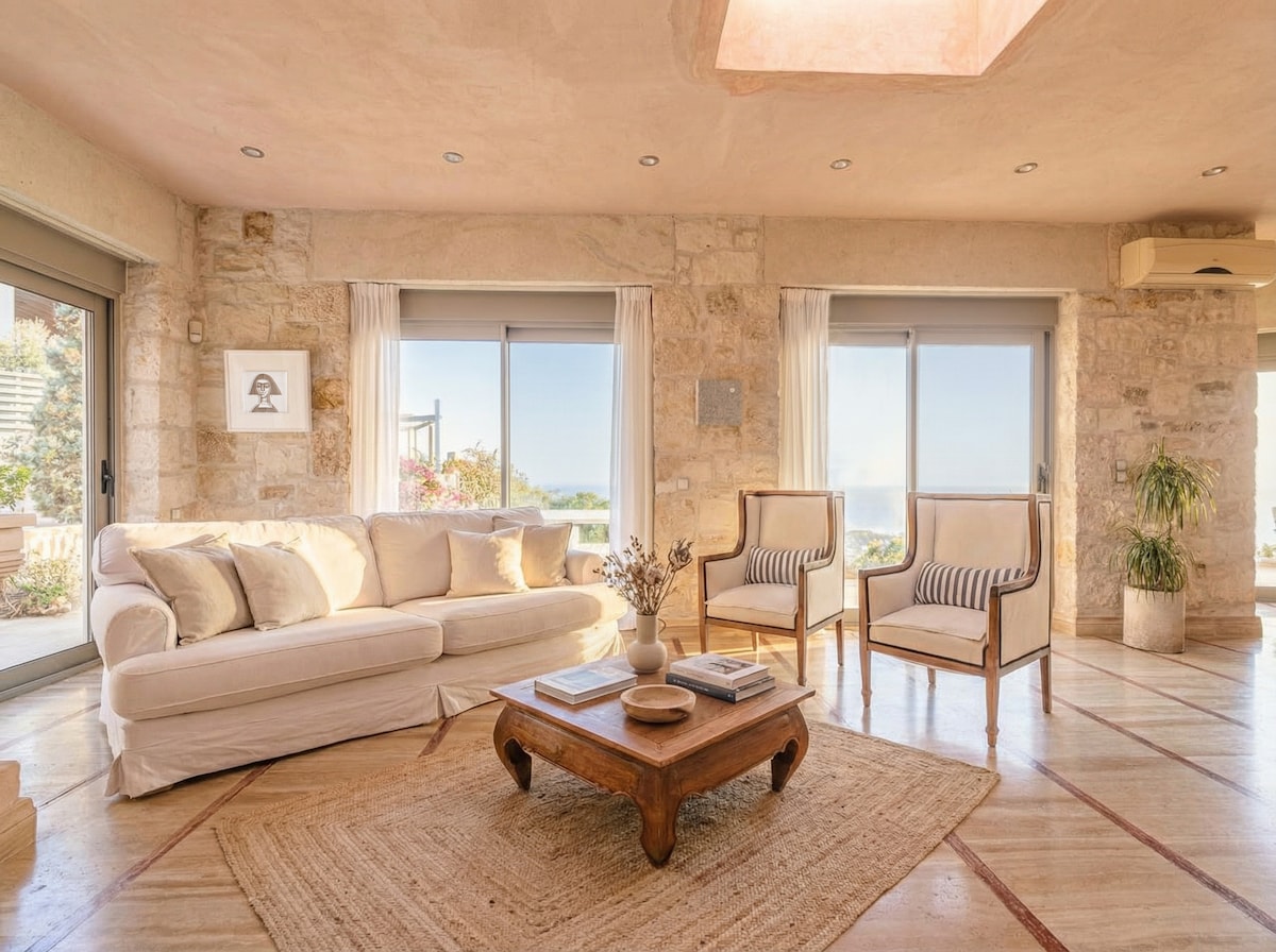 Hersonissos Beach Villa is approved by the Greek Tourism Organization & managed by "etouri vacation rental management". Experience comfort and privacy at Hersonissos Beach Villa, a three-storey waterfront property just steps from the sandy beach of Hersonissos. The 300 m² villa comfortably accommodates up to 10 guests in five bedrooms, with space for an additional guest if needed.