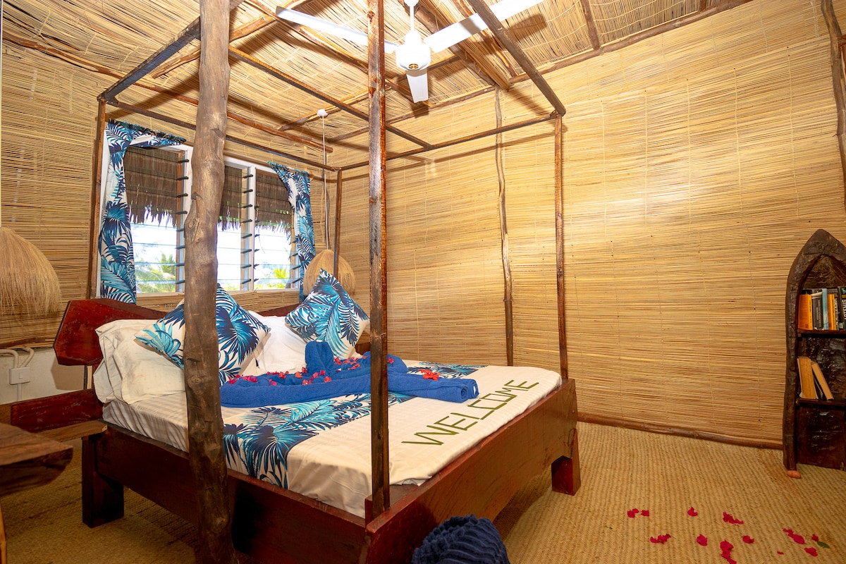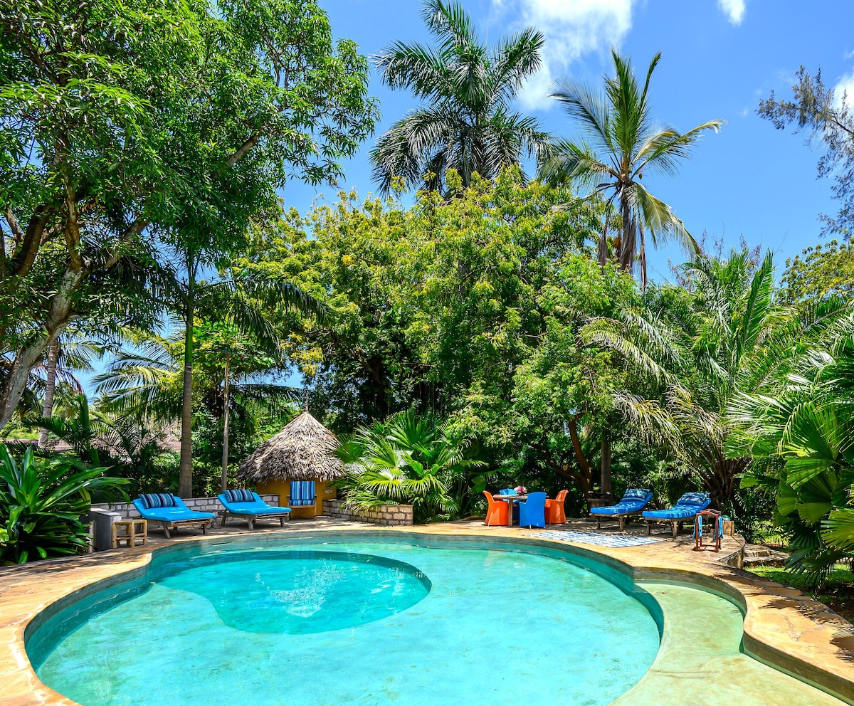 This charming, one-of-a-kind place is located just 5 mins walk from Jacaranda beach, 7kms north of Watamu. Kijiwe Villas consists of 2 double bedrooms downstairs, one room with 2 double beds and living room upstairs and a one-bedroom cottage. All rooms are en-suite. Set in a large lush garden with lots of outdoor seating. A perfect place to relax for a romantic getaway or enjoy with a group of friends. We also own a wonderful beach restaurant where you can enjoy a free sun bed.