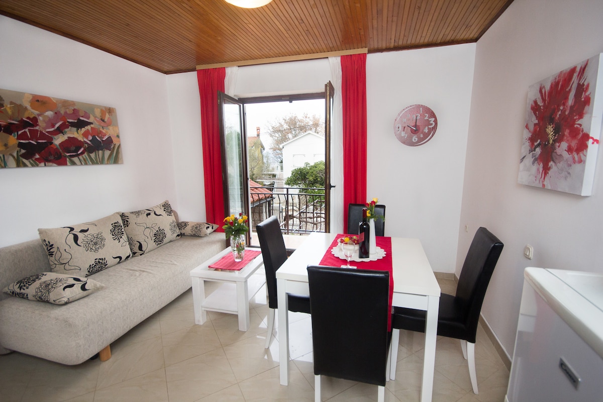 Opustite se u ovom ugodnom i moderno uređenom smještaju koji je sastavljen od jedne spavace sobe sa balkonom, moderne kupaonice sa led illuminacijom i podnim grijanjem gdje možete oprati svoje veš, i velike dnevne sobe u kojoj je udobni trosjed koji je napravljen da kada se razvuče dostigne širinu od 160cm, te komotno spavaju dvije odrasle osobe. Opremljen je velikim smart android televizorom, te kompletno opremljene moderne kuhinje sa otokom i pogledom na veliku terasu sa pogledom na more