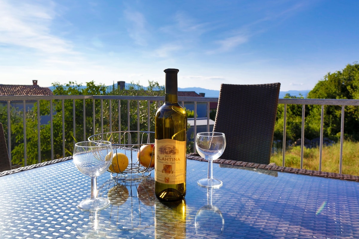 Ova prekrasna kamena kuća okružena prirodom nalazi se u blizini Malinske. Doživite očaravajući ambijent i uživajte u prekrasnom panoramskom pogledu na Kvarnerski zaljev, obronke Učke i Rijeku. U njegovanoj okućnici nalazi se i bazen koji će pružiti osvježenje u vrućim ljetnim danima. Tražite li osvježenje u moru, posjetite prekrasne plaže u Malinskoj, Baškoj ili pješčanu plažu u Risiki. Upoznajte bogatu povijesnu baštinu ovog otoka. Opustite se sa svojom obitelji u ovom ugodnom smještaju.