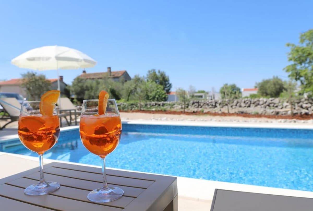 An old, fenced in and FULLY AIRCONDITIONED country house with a touch of country flair,soul and charming details. It is surrounded with flowers and greeness. It is very much loved, cherished and I hope you will feal just like at home. Take a look at our amenities. The pool area is spacious and hidden from all the looks. Groceries shop is near. Every year we invest into something new so it is very well equipped. Daily pet fee 20 eur per pet to be paid in cash upon arrival.