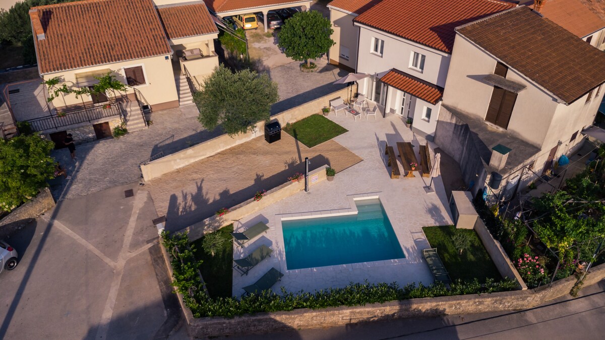 This big spacious rustic house is ideal for 16-20 people. It has a swimming pool and barbecue area. It is situated on two floors in four residential units. Each residential unit has its own kitchen, living room and bathroom. In total the house has 9 beds in 8 bedrooms. Holiday house Plovanija is located in a quiet area, 2000m from the sea. Possibility of accommodation for up to 20 people, upon request.