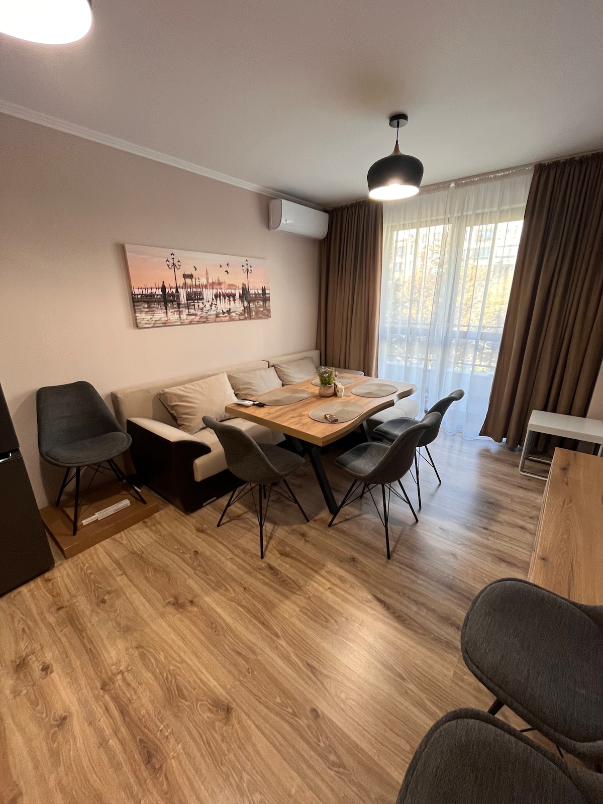 Spacious and bright apartment in Mladost district with one bedroom and a large sofa. Suitable for a maximum of four people. The place has an incredible view of the Eastern Stara Planina, and if you like to admire unique sunsets every evening, this is the perfect place for you. If heights bother you, however, it is better to look elsewhere as the apartment is on one of the top floors of a high-rise block. Come with your friends, family or pet and experience Sliven and its sights.