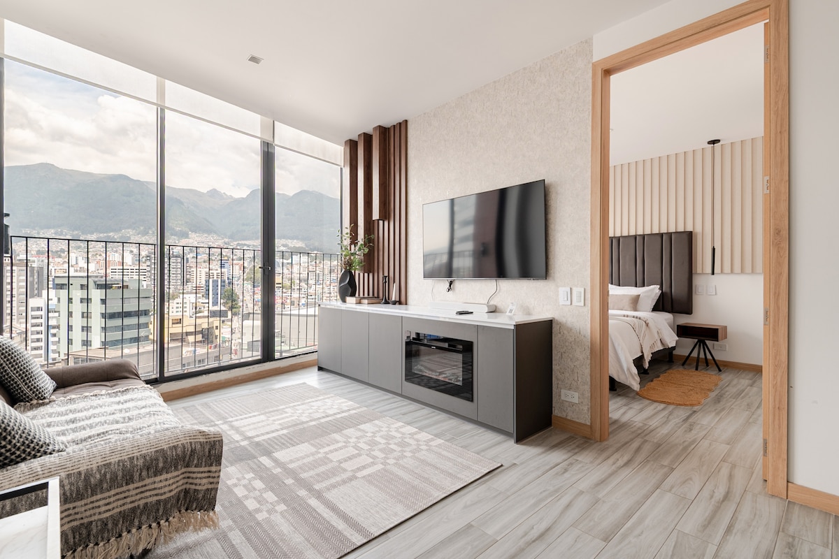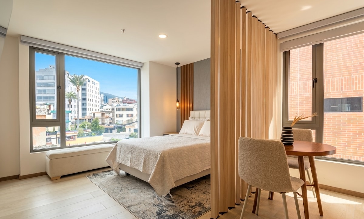 Modern, brand-new studio on the 14th floor with direct views of La Carolina Park. Studio amenities: • High-speed fiber optic WiFi • 55” QLED Smart TV • Ultra-comfortable bed • Fully equipped kitchen • Modern bathroom • Smart lock • 24/7 security Social areas (17th floor): • Gym • Coworking area with WiFi • Game room • BBQ area • Jacuzzi (available only for stays longer than two nights) Prime location, just 15 minutes from the Quito Metro, malls, and restaurants.