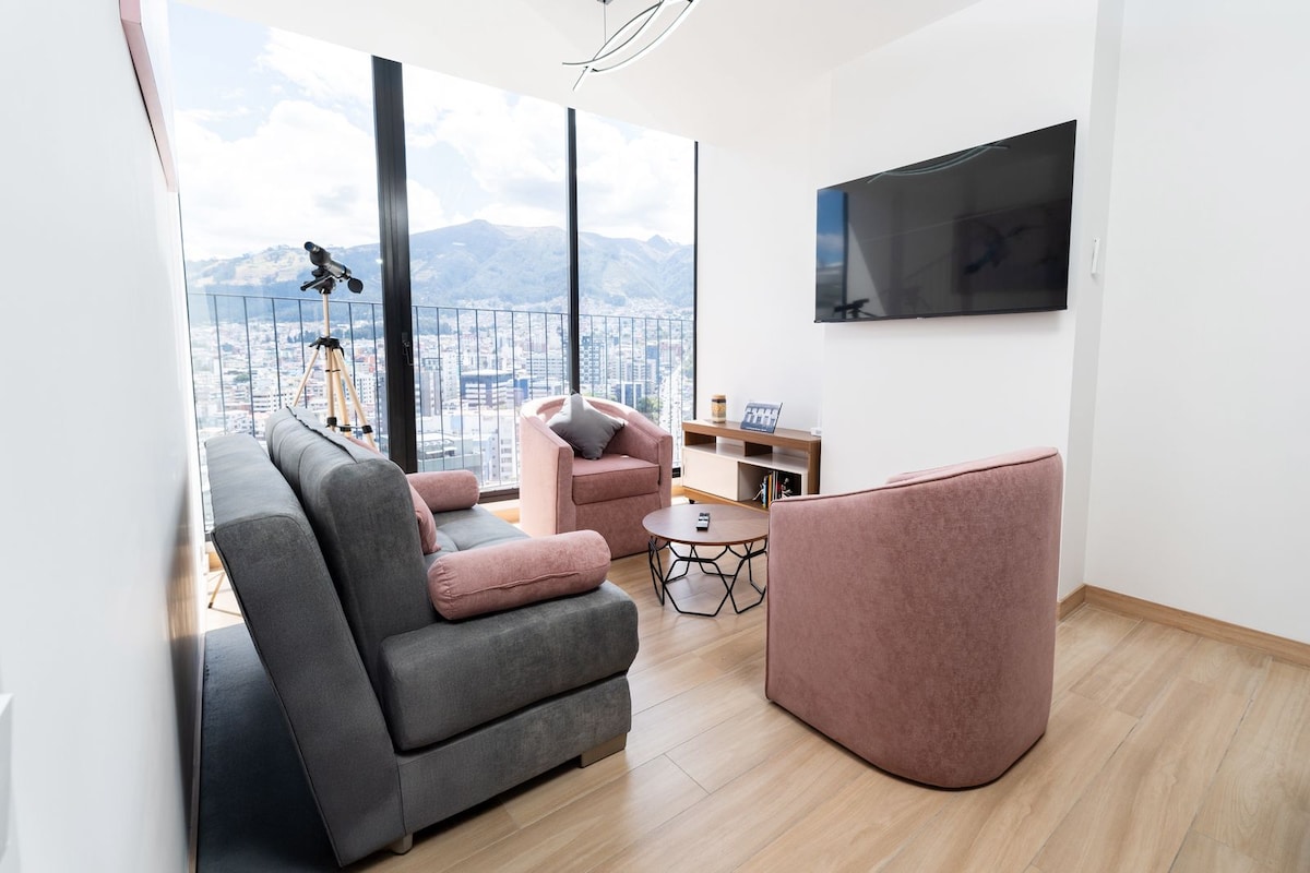 Modern, brand-new studio on the 14th floor with direct views of La Carolina Park. Studio amenities: • High-speed fiber optic WiFi • 55” QLED Smart TV • Ultra-comfortable bed • Fully equipped kitchen • Modern bathroom • Smart lock • 24/7 security Social areas (17th floor): • Gym • Coworking area with WiFi • Game room • BBQ area • Jacuzzi (available only for stays longer than two nights) Prime location, just 15 minutes from the Quito Metro, malls, and restaurants.