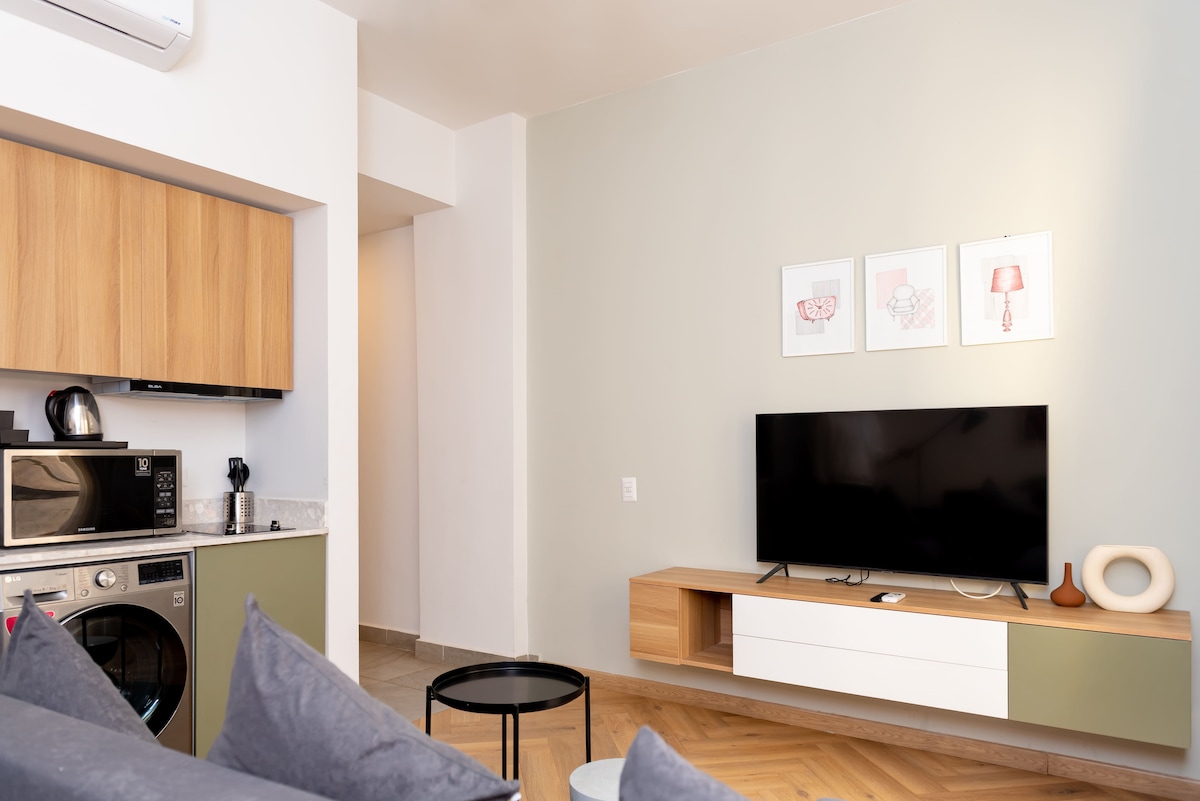 Stay in our stylish 3-bedroom apartment (110 sqm) designed in a soft industrial style. Features 1 queen bed, 4 single beds, a spacious living area with sofa, armchairs, coffee tables & a swing. Enjoy a fully equipped kitchen (fridge, stove, washer, filtered water), dining table for 6, and a modern bathroom with shower & hair dryer. Relax with a 55" Smart TV & free WiFi. Includes free parking. Perfect for families & groups seeking comfort and design.