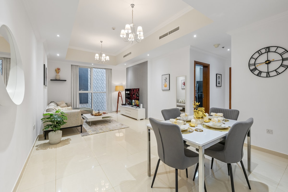 Experience luxury on the 33rd floor at the 5 Star Paramount Midtown Hotel and Residence, Dubai near Downtown and Metro. This stylish 2-bedroom, 2.5-bathroom 125(sqm) apartment offers stunning views of the Burj Khalifa and ocean. Enjoy high class amenities, a fully equipped kitchen, and a cozy living room. Located in Business Bay, it's minutes from Dubai Mall and top attractions. Sleeps 8 (6 adults + 2 small kids). Includes high-speed Wi-Fi, TVs, private parking, and baby essentials upon request.