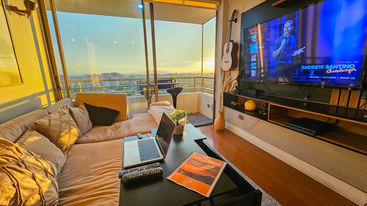La mejor panorámica de Stgo y ubicación. Mall Parque Arauco, Parque Araucano, Clínica Alemana y Las Condes, Restaurantes, Cine, supermercados... Cercano a Metro Manquehue y accesos a Centros de Ski. Muy cómodo, orientación Sur, ventiladores, A/C*, calefacción central (invierno: may/sep), WiFi, seguridad 24h, cortinas black out, lavadora/secadora en departamento, smart TV, estacionamiento, piscina panorámica y climatizada, sauna,GYM. Accesos digitales. Check in: 15:00 Check out: 11:00 *Solicitar