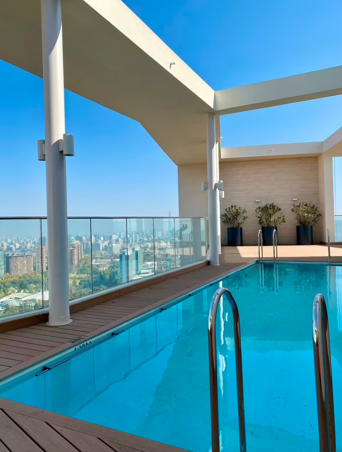 Luminoso estudio con increíbles vistas de la ciudad. Totalmente equipado, con aire acondicionado, cocina completa, microondas, horno y utensilios. A pasos del Parque Arauco! Disfruta en el verano de la espectacular piscina en la azotea que tiene el edificio, solo debes reservar una hora para utilizarla sin costo alguno. Además, cuenta con estacionamiento privado subterráneo de 4,90 mts de largo por 2,30 mts de ancho. (Altura máxima 2,10 mts)