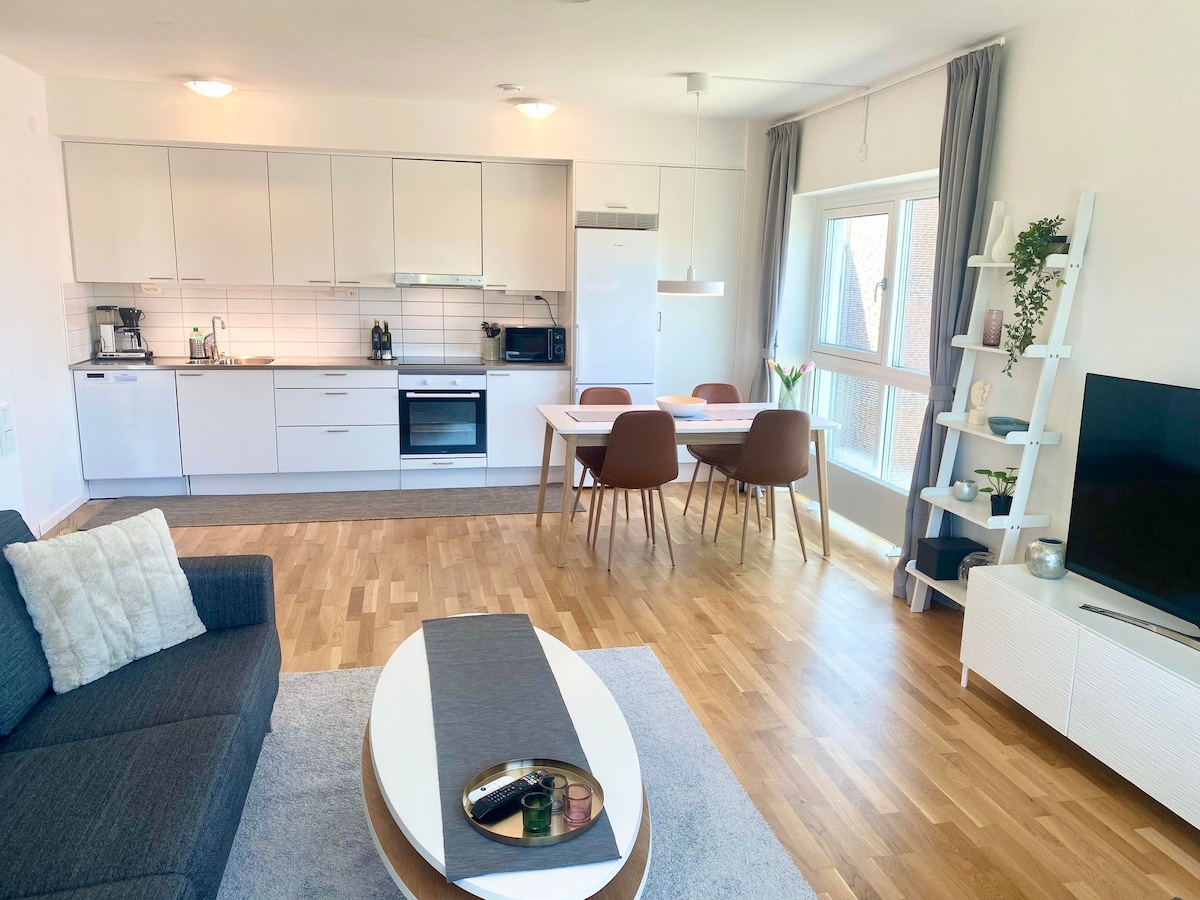 Fresh and newly built studio apartment with a lot of sunlight. - King size bed 210x210 cm - Convertible sofa 145x200 cm The whole apartment is 55 m² and all yours during your stay. - Free parking on the street right outside the house - Grocery store nearby - 2 bus stations nearby. 20-30 min to the city center by bus - 15 min to city center by car If you have any questions, please don’t hesitate to ask!