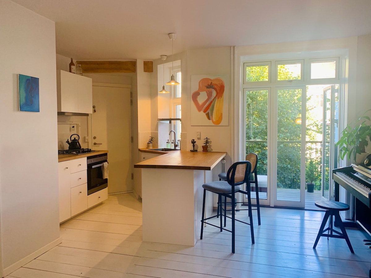 Enjoy a stylish experience at this centrally-located place. Perfect for a single traveller or a couple. Recently renovated! Features open kitchen, electric piano, balcony with sitting area, a bedroom with a new comfortable Auping queen-size bed, height-regulated desk with ergonomic office chair. Very small but functional bathroom with shower. Third floor (no lift). Trendy area just off Sankt Hans Torv, with numerous cafe's and fashionable shops.