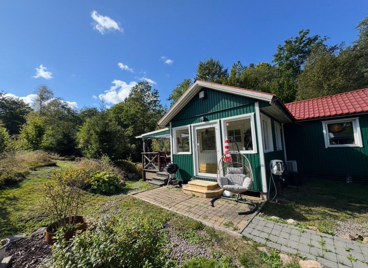 A cottage with sauna, hot tube and open fire outdoors in the forest. Stuga med sauna, spabad och öppen spis utomhus. Modern nyrenoverad fastighet som håller hög standard. Fastigheten består av en huvudstuga och mindre spa-stuga med tillhörande stenlagd grillplats och spabad. Skärmtak och spalje runt grillplatsen och spabadet och stort trädäck runt omkring. Idylliskt skogsmiljö mitt i Skåne nära Ringsjön med obegränsade möjligheter för fiske, vandring, frisk luft, bad, utflykt och avkoppling.