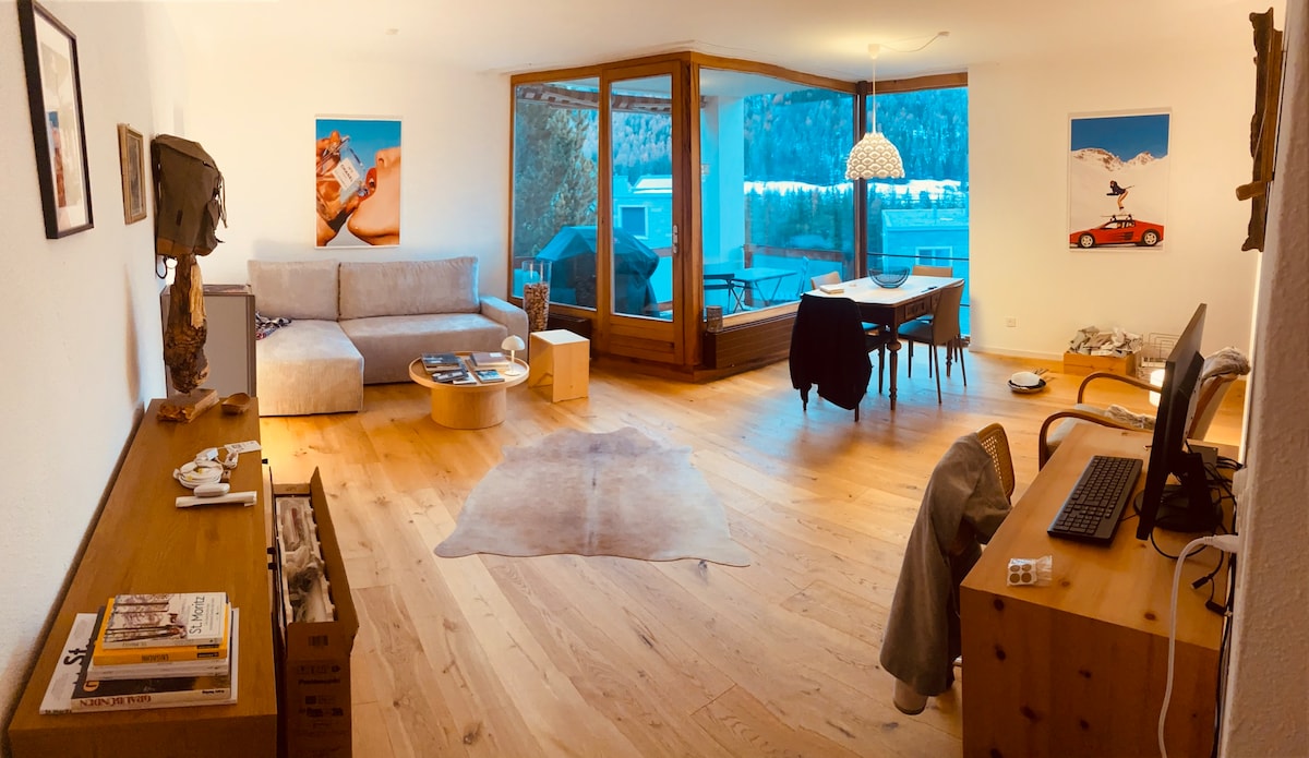 Our newly renovated and cosy loft-apartment with a Scandinavian touch offers you an open view to the upper Engadin Valley. It is located at a calm and sunny spot in La Punt and is a perfect nest for all kind of outdoor activities. As a part of the La Mora 4 star residence you can use a shared sauna, a games and billiard room and a reception desk. It is easily accessible either by public transport or car. Hotel standard bed sheets, towels and kitchen towels are included in the cleaning fee.