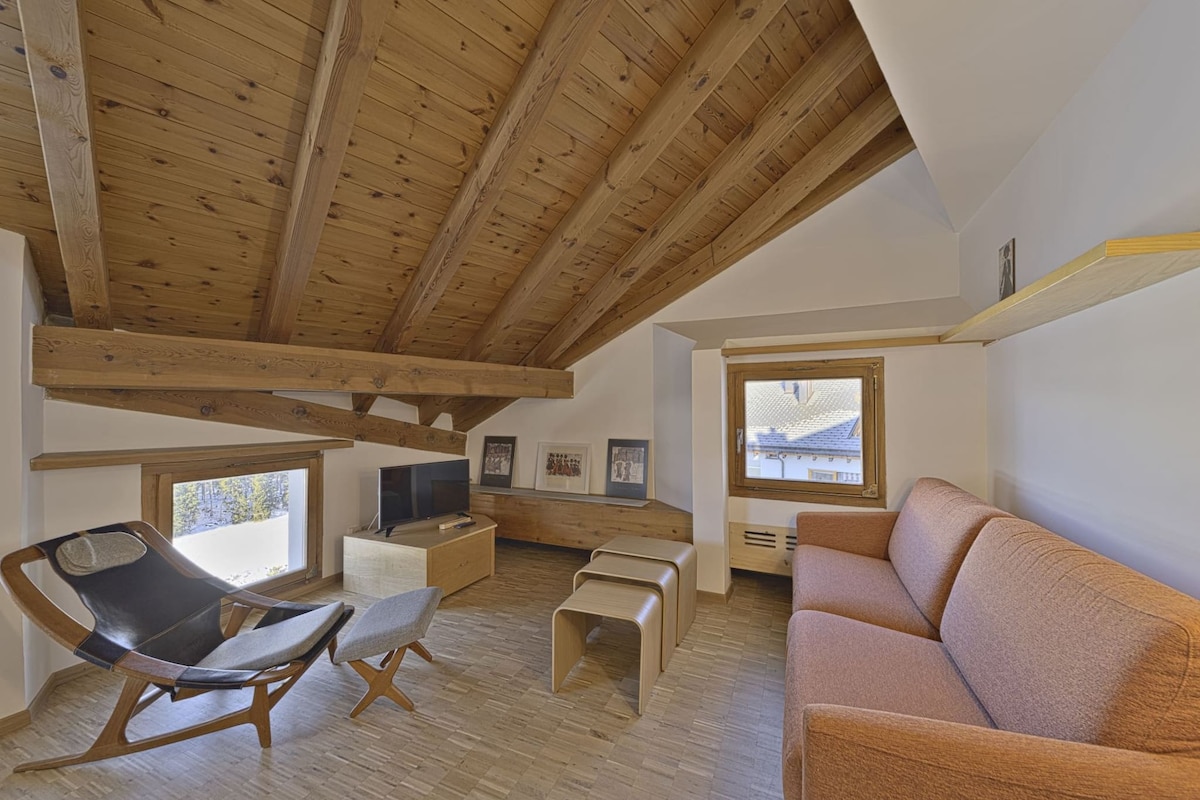 Bright, newly renovated Engadine-style apartment on the top floor with balcony, quietly located in the charming village of Champfèr beneath the Suvretta, just minutes from St. Moritz. Windows on two sides provide plenty of natural light, peace, and privacy. High-quality oak floors, Swiss pine details, and an electric fireplace create a cosy atmosphere. Alpine views from the balcony, plus indoor pool and sauna in the building. Ideal for up to 6 guests.