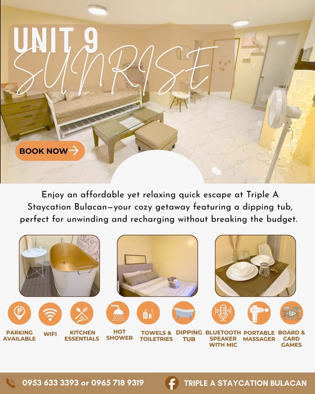 52 sq.m loft-style Staycation Hotel 2.5 HP (2F) and 1.5 HP (GF) Airconditoned Unit Key Features: Fully Functional Kotchen Refrigerator and Microwave oven Induction cooker with range hood Complete set of Kitchenwares Toilet with Shower 4-seater Dining Table Bedroom : Good for 4 pax (Full Double with Pull-out Semi Double) Unli-Billiards Arcade Machine (2php = 3 minutes) Android TV Screen - Netflix, Youtube etc. Board games, cards etc. Mini Karaoke Mini Bar