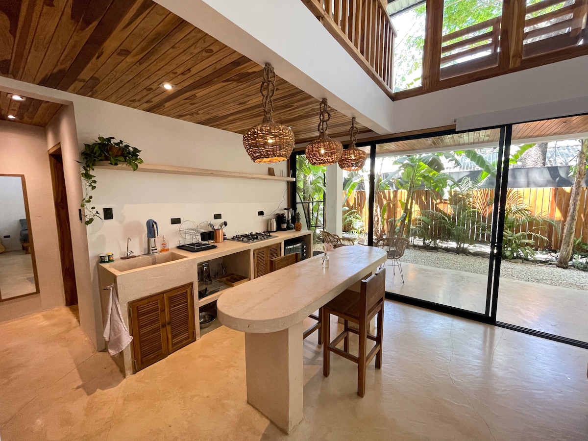 Absorb the charm and rhythm of beautiful Mal Pais. Our spacious penthouse is set back in a tropical oasis with a cozy indoor setup which opens up to a huge tropical pool view balcony. Walk to the beautiful beaches and tide pools. Near the best surf spots! Quiet location, yet a short 10 min drive to downtown's main bustle where you'll find excellent dining options and a fun nightlife. Grocery store, brewery and pizzeria around the corner. Purified water on tap! Fiber Optic WiFi ⚡️ 100 Mbps
