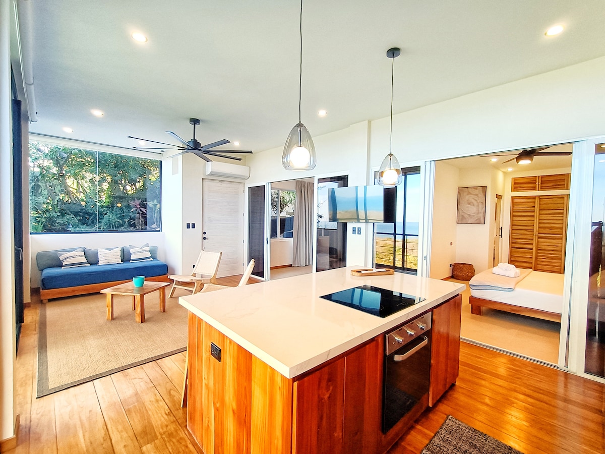 Perched atop a hill with expansive horizons, a beautiful sunrise is the alarm clock every morning in this studio apartment. With views of the ocean, canyon, mountains, and all of the wildlife that resides in the trees, this house is made for those who enjoy drinking their coffee or tea early in the morning, while listening to the forest come alive with sounds of howler monkeys, songbirds and insects as nature awakens to greet the sun.