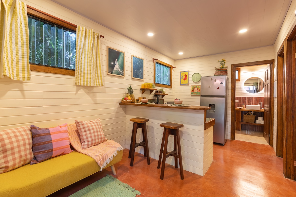 Beautiful studio apartment in a safe and quiet neighborhood surrounded by nature, yet only a 5 minute walk to the beautiful beaches of Santa Teresa. All the conveniences of town with great shops and restaurants nearby. The apartment includes, air conditioning, fast fiber optic wifi, backup Starlink, hot water shower, smart tv, fully equipped kitchen and secure on-site parking. There is also a large, shared saltwater pool for all guests to enjoy. Adults only (18+), not suitable for children.