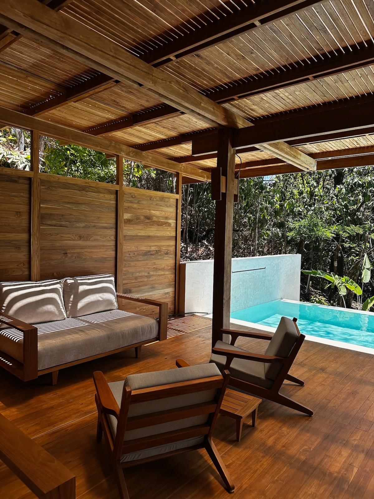 One of two brand new studio bungalows @ ArtStudios in Playa Hermosa, perfect for solo travelers or couples. Savor the timeless design, high-end finishes, and smart touches like pin-code entry, bedside light switches, universal outlets and private high-speed WiFi. Enjoy a full kitchen, Sonos system, private deck with rock garden, gated entry, and access to a pool and rope-net lounge platform. Just one minute’s drive to world-class surf. Comfort meets style in this thoughtfully crafted space.