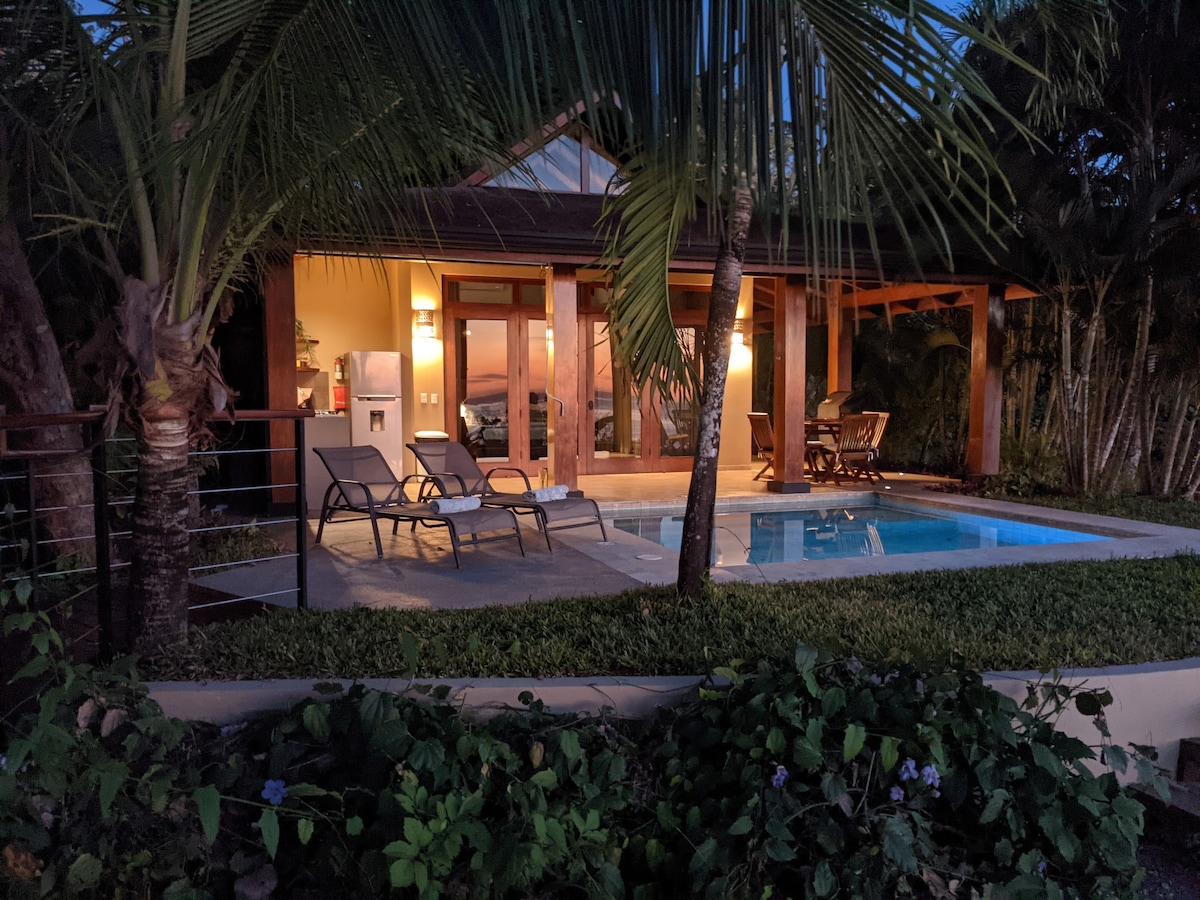 Coastal Vistas Casa | Santa Teresa Coast Views is a private, high-end luxury suite in Mal País with panoramic Santa Teresa coastline and jungle valley views. Designed for romance or focused solo stays, it features a plunge pool, gourmet kitchen, and seamless indoor-outdoor living in a secure, tranquil setting. Wake to birds and wildlife, then reach beaches, surf, and dining in minutes—ideal for couples or a solo digital nomad seeking privacy and inspiration.