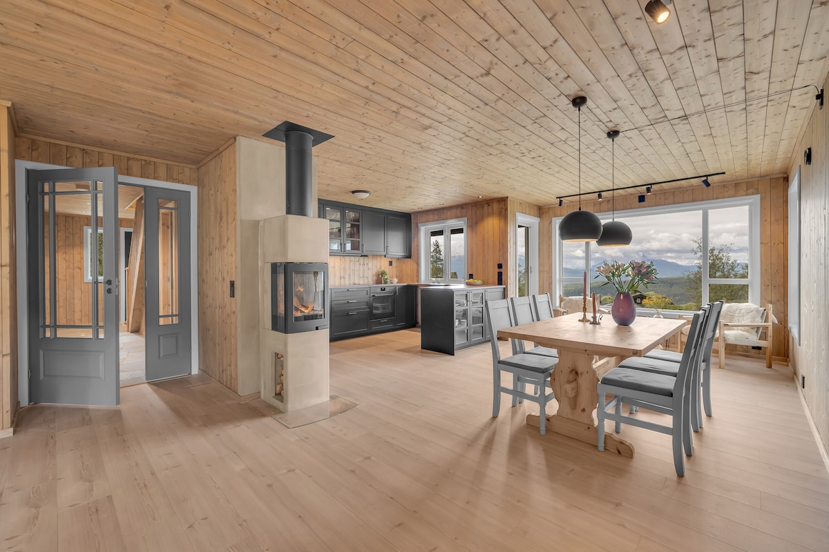 Moderne og nyoppført hytte med stort allrom og fantastisk utsikt gjennom vinduer fra gulv til tak. Nyt morgenkaffen i godstolen, fyr i ovnen og utsikten før ski out. Hyttekontor fungerer veldig bra med rask fiberlinje. Opplev Aurora Borealis fra terrassen. Fyr opp grillen og bålet under nordlyset. Eller se favorittserien på stor TV i stua. To av soverommene har også TV med apper. Ingen av TV`ene har lineær-TV. Håndduker og sengklær inkludert Lader for bil tilgjengelig for gjester.