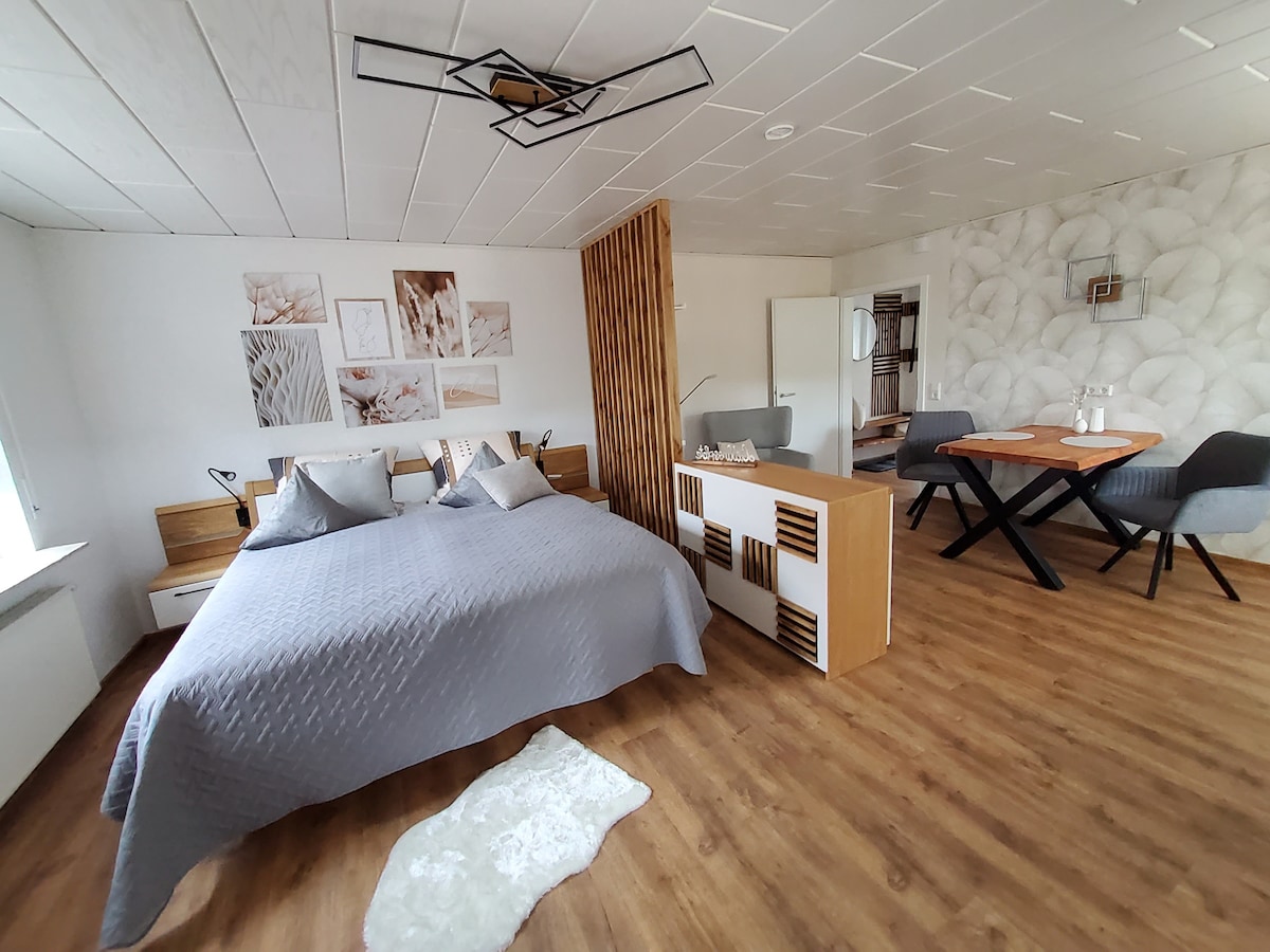 Liebe potenzielle Gäste: Ob auf der Durchreise, für eine kleine Auszeit oder aber für länger - unsere Wohnung ist schnell erreichbar und ein guter Ort, um abends zu entspannen - z.B. auf dem Balkon mit Weitblick. Das Schlafsofa im Wohnzimmer ist sehr bequem, sodass man gut in zwei Räumen schlafen kann. Im Ort gibt es ein schönes Freibad und gute Gastronomie - drumherum viel Wald. Unser Café hat wochentags ab 6 bzw. am Wochenende ab 7 Uhr Frühstück.