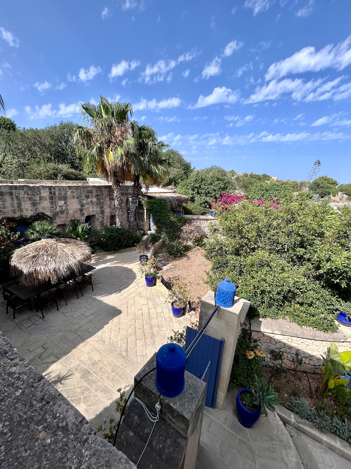 Detached 400yr old authentic gozitan Farmhouse/Villa Estate (5000sq.mtrs), recently renovated to high standards. It is perched on elevated grounds giving full view of Wied il-Ghasri valley/beach, Ta Giordan Lighthouse, an old chapel and the sea. Property has private driveway/car port. Grounds offer complete tranquility and amazing views. Free range chickens, roosters, Alpacas, goat, friendly cats, 2 peacocks, 2 Red Winged Macaws and 2 monkeys will keep you company!