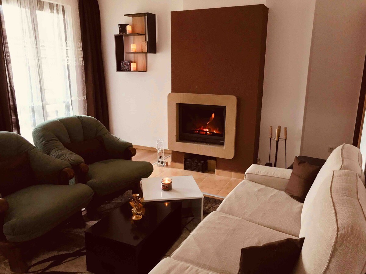 Sapareva Kashta is a modern maisonette that combines the comfort of a modern house with the cosines of a mountain villa with a wooden scent. The Villa itself is very spacious! It provides a well-equipped kitchen, living room with fireplace, lounge area, dining area for 8 people as well as a nice spacious shower/bathroom. The balcony provides a great view of the sunsets, and nice spot to have dinner/wine.