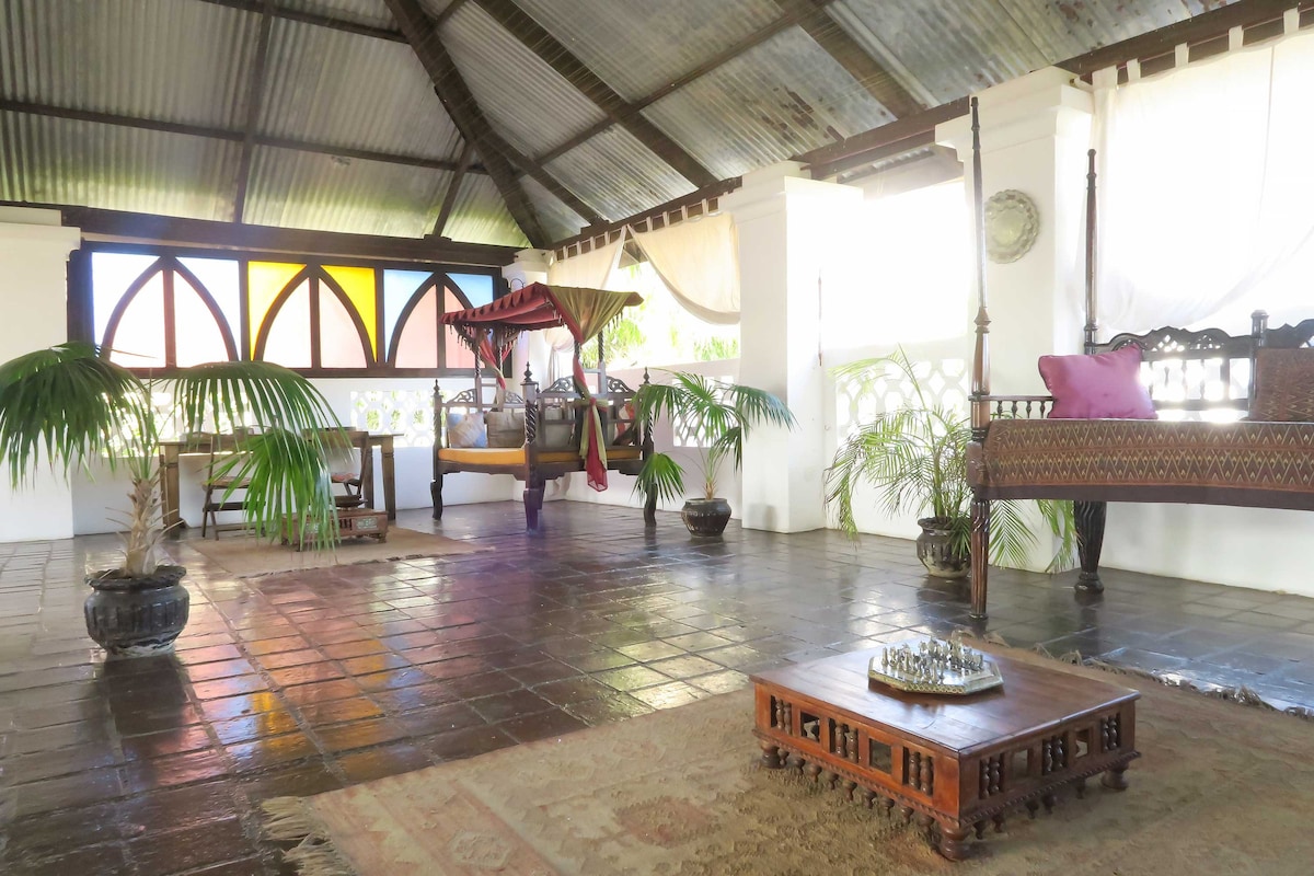 Traditional Swahili style house, stands on coral headland overlooking sea, beach, beautiful flowering gardens, private access to beach. Swimming pool recently installed, SEE HOUSE RULES Villa has 2 levels & views of Indian Ocean, private direct access to the beach, which stretches out either side, within the Marine Park. Includes 3 staff, cook, and daily room service, and gardener. Sleeps up to 10. Easily adapted and made comfortable to host smaller groups, by using just the upstairs bedrooms.
