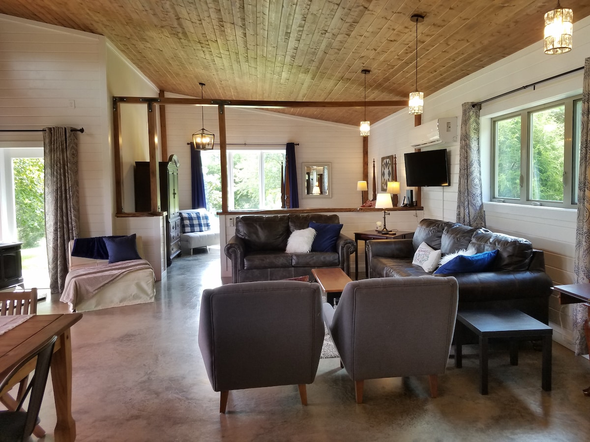 This 1,100 SF farmhouse is open and spacious - surrounded by nature with beautiful views. Don't be surprised if you see deer, wild turkeys, rabbits, and fireflies! Very comfortable and relaxing inside and out. There is an inviting deck for enjoying a cup of coffee or a glass of wine by the fire pit. Also, a cozy gas fireplace inside! No smoking allowed. Excellent high-speed internet. Gas and groceries are only 7-15 minutes away. One queen bed and 2 portable twins if needed.