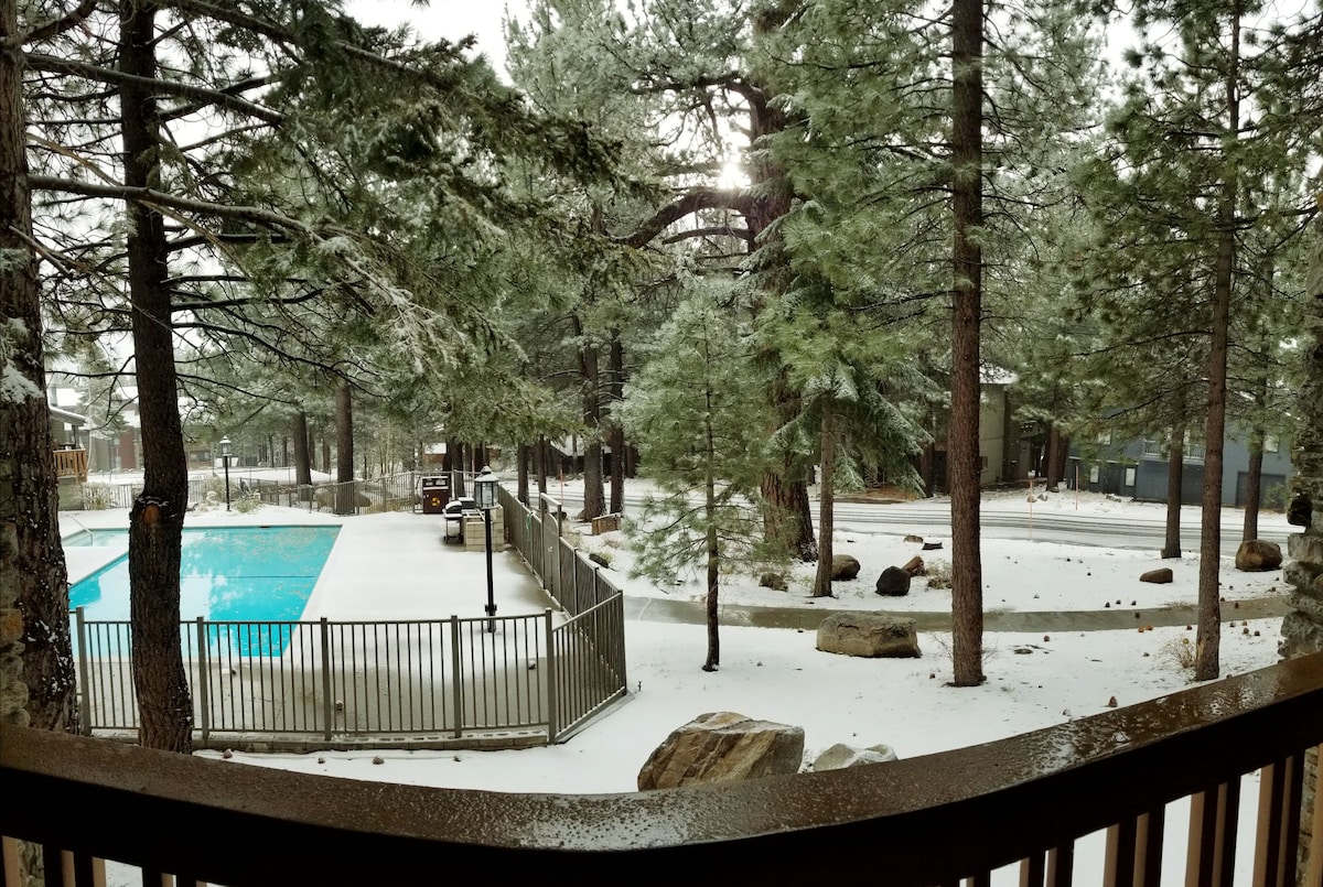 This spacious, bright and remodeled 1bd 1ba condo in the Sunrise complex sleeps 4 and is the perfect place to relax after exploring all that Mammoth Lakes has to offer. Enjoy coffee on the private patio with peek-a-boo views of the Sherwin's and relax in the seasonal pool and/or hot tub before chilling on the couch next to the fireplace. There is plenty of parking for trailers and storage for your gear whether you are visiting for skiing, biking, fishing, hiking, golfing or boating.