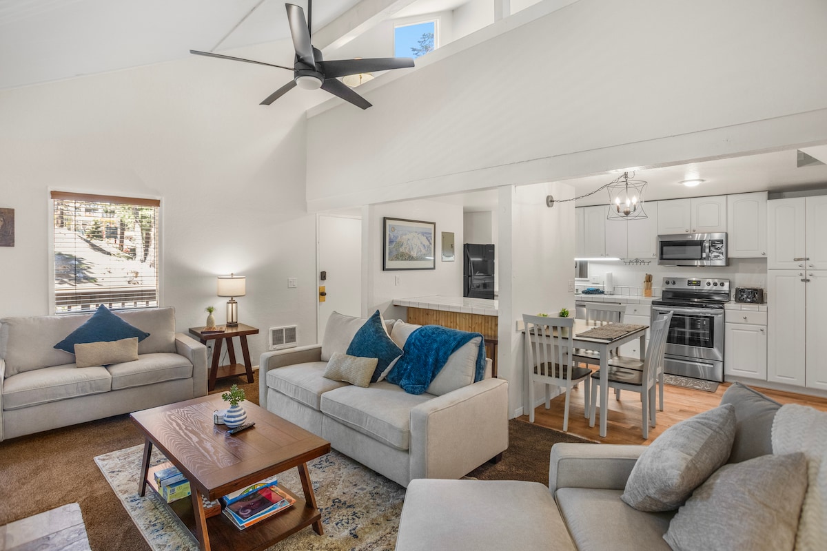 This NEW, REMODELED Mountain Shadows Studio is clean, quiet, modern and sleeps 2. Located in the heart of Mammoth Lakes, this beautiful Studio has tons of natural light, a private deck, a dedicated workspace, a fully stocked kitchen with modern appliances, dishwasher, fast Wi-Fi, an epic 65” Smart TV/ Soundbar and parking for 2 vehicles. Mountain Shadows has multiple jacuzzi on the property, laundry facilities, and a pool (summer months). Walking distance of restaurants, grocery and ski shuttle