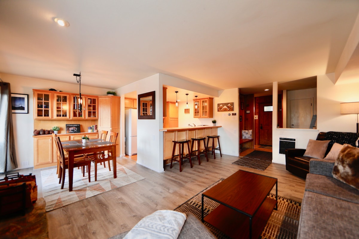 This newly remodeled Mammoth Estates condo is just a short walk to the Village restaurants and Gondola and has all of the amenities of home. Comfortably sleeps up to 6 people with a King size bed in one room and 2 full size beds and a twin bed in the other room. The kitchen is fully equipped with everything you need for a delicious stay-in meal. The complex features a rec area with pool/hot tub and a rec room just steps from the unit. You will be central to everything going on in Mammoth!