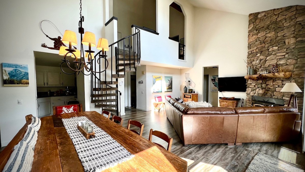 SPACIOUS 4 Bed + LOFT end unit with mountain views. Our vacation home is close to trails, restaurants and shops to Mammoth Mountain. Large living area for people to gather, but space for those looking for quiet time. Great for group and multi-families. Includes a fully equipped kitchen, dining area for 12, fireplace, new hardwood floors in dining/living area, balcony, 55" Smart TV in the living room, and smart TVs in all bedrooms. Free Wifi and washer/dryer.