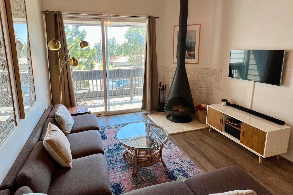 Relax in this renovated Mammoth Lakes condo—walk to shops, dining & trails or hop the shuttle to Mammoth Mountain. Perfect for couples or small families, it features vaulted ceilings, fast WiFi & access to a heated pool, hot tub & sauna! ⭐ “Everything was spotless, stylish, and walkable—one of the nicest stays we’ve had!” – Daniel 🌄 HIGHLIGHTS ✓ Walk to town, trails & Mammoth shuttle ✓ Hot tub, heated pool & sauna access ✓ Fast WiFi + workspace for remote stays