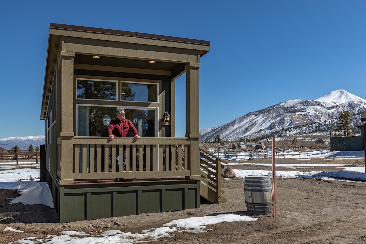 Crowley Cabin sleeps up to 6 (best for 4 though), with a queen bed, two bunk beds, and a futon. It has a full kitchen, 1 bathroom, and spacious living area for a tiny home. One of our most affordable cabins—clean and well-appointed, but rustic—ideal for active guests who value function over frills. Pet-friendly and privately located at the north end of Sierra Meadows Ranch, just 1/10 mile from town, trails, and free trolley access. Certified Property Authorization Number TOML-CPAN-1149