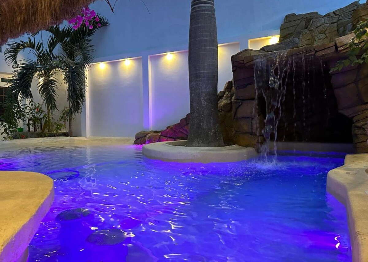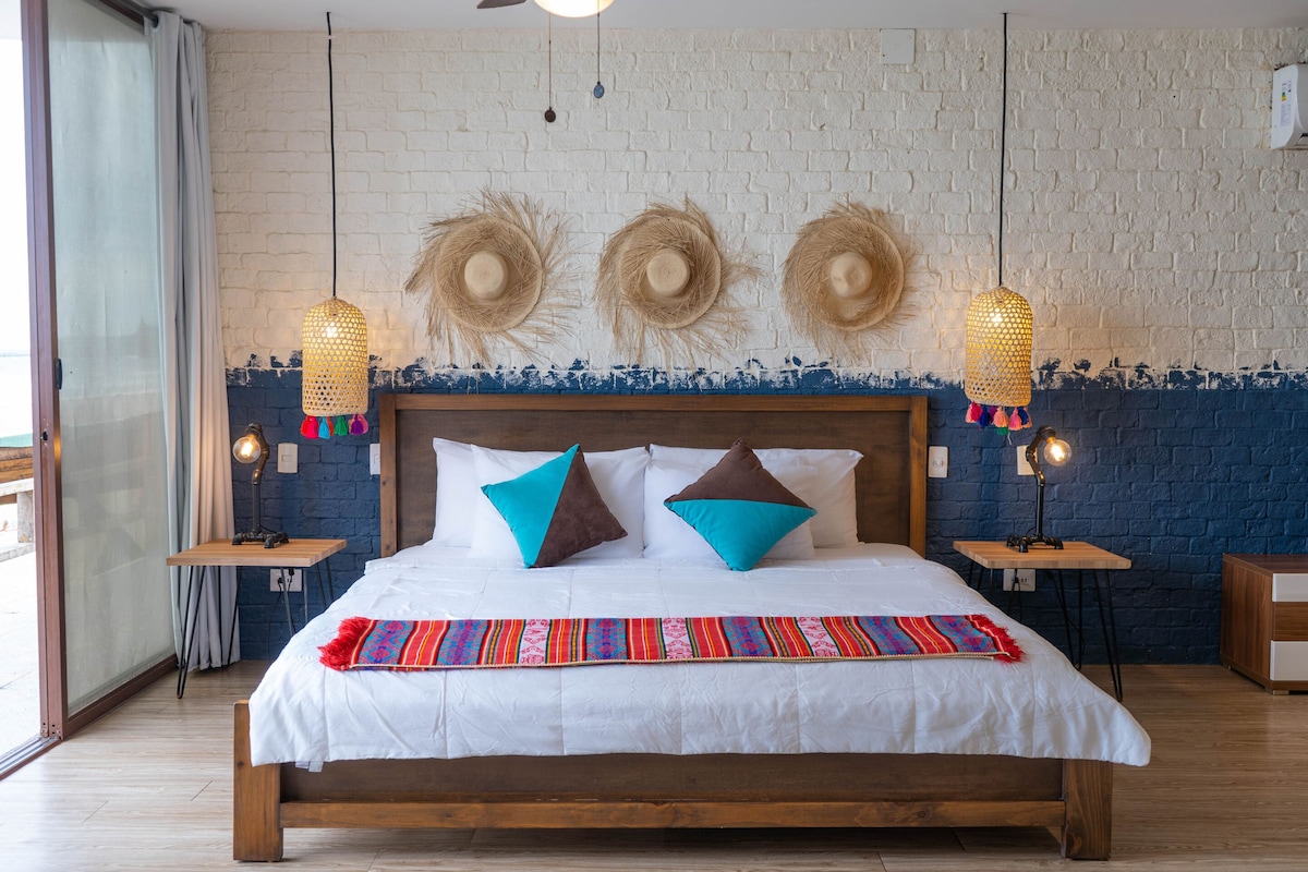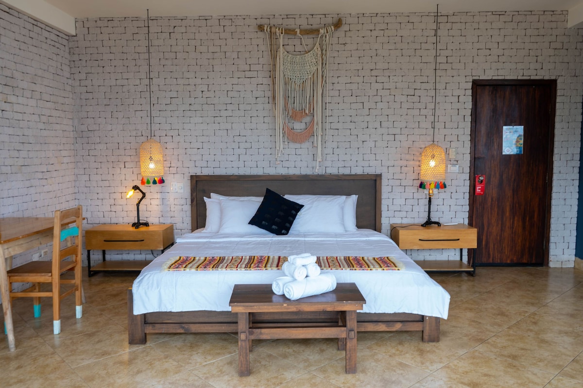 Enjoy your cozy Room - beachfront at the point. Ideal workspace with your outdoor seating area on the balcony with views of your pool and lounge just below in the garden. Your room has a matrimonial bed and a futon. We value our tranquility here and expect our guests to do the same. Its only a short walk to the vibrant party of Montañita. *Surf Lessons & Rentals *Micro-Brewery/Restaurant *Coffee/ Tea *Laundry Service *Pool &Jacuzzi *60" TV Lounge *Store