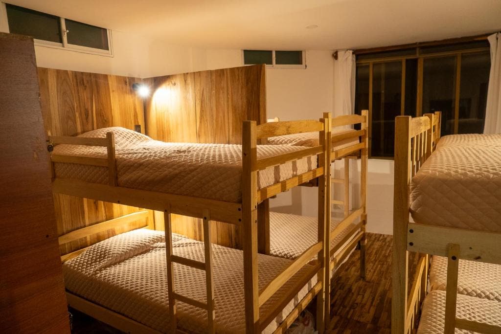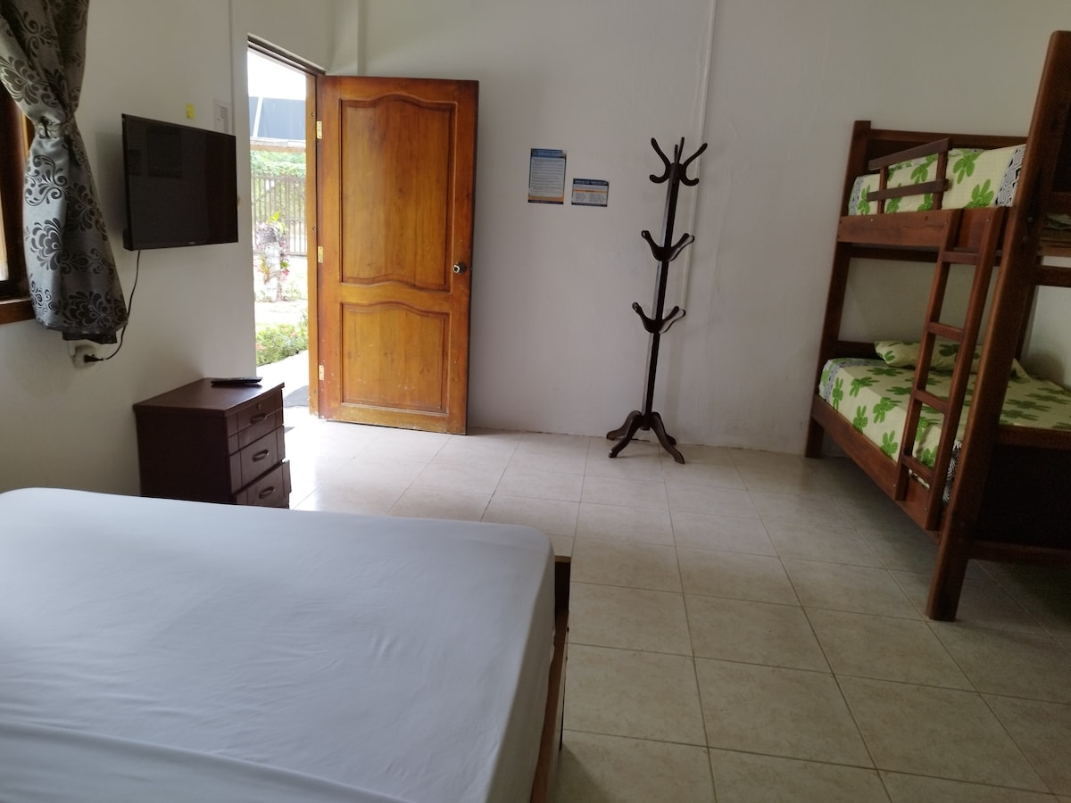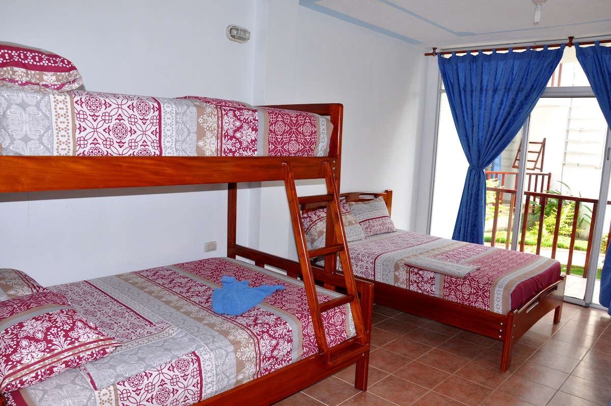 Habitación en planta baja con una cama matrimonial y dos literas de 1.5 plazas, ideal para grupos o familias de hasta 6 personas. Tiene aire acondicionado, baño privado funcional, Smart TV con Netflix, estante tipo armario y colgador de ropa. Cómoda y bien ventilada. Acceso libre a piscina, cocina, parrilla, jardines, hamacas y más. A solo 7 minutos de la playa y del centro de Montañita, pero alejado del ruido. Tranquilidad y espacio para compartir.