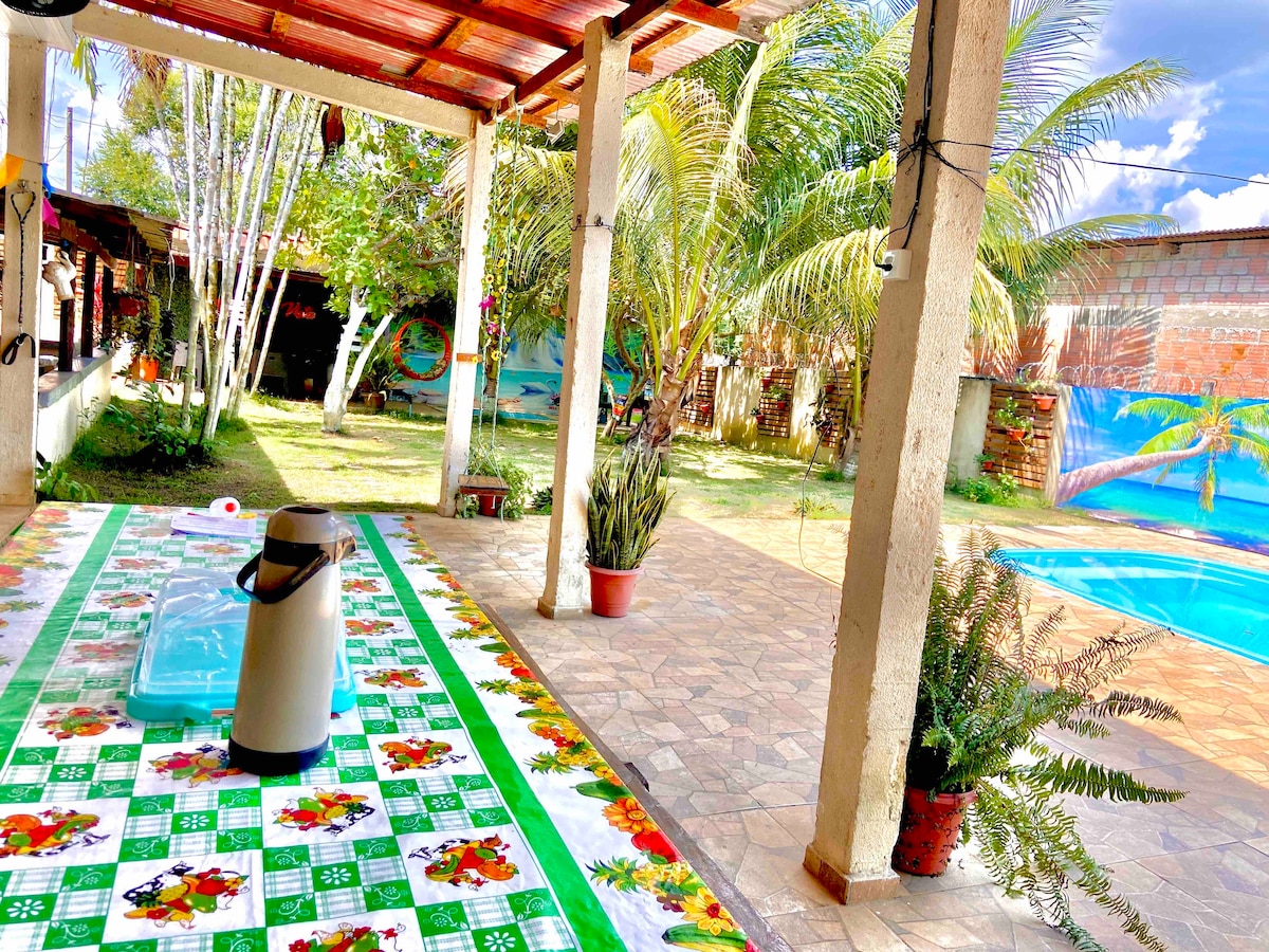 Cap. para 20 pessoas. -Ambiente Limpo e organizado -Piscina adulta (hidro e cascata) e Infantil -Área coberta/área ao ar livre -Edícula Churrasqueira abafo e tradicional -Sinuca -Mesas 06 jogos completo -Pergolato c/mesas -Fogão e forno tradicional -Bebedouro (prec.comprar a agua) -Geleiras, armários, panelas -Dormitório Climatizado -Salão De Eventos (aberto) - A casa totalmente completa ao hospede. Obs: Levar produtos de higiene pessoal. Oferec. Tolhas c/taxa exta