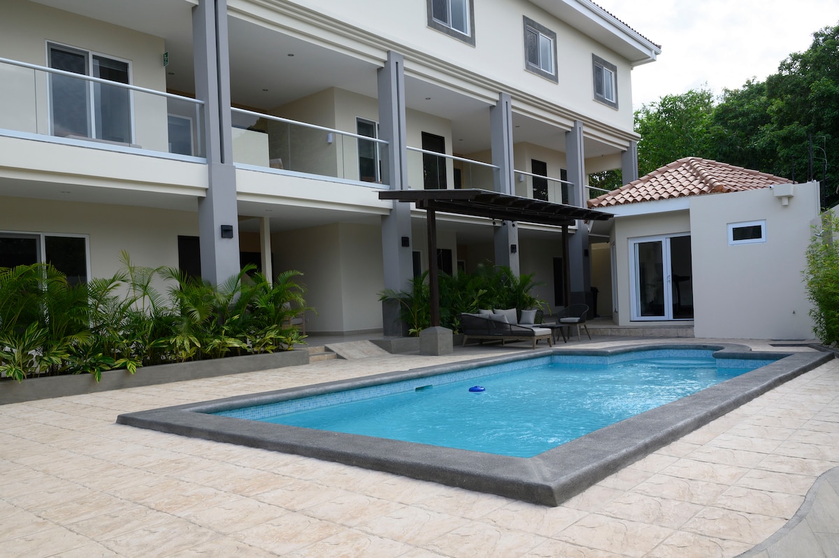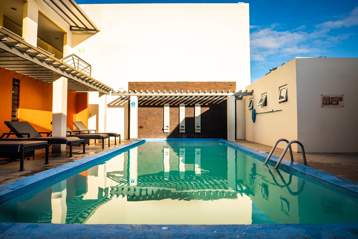 This apartment is located in Santo Domingo, the most exclusive place in Managua. It is a small new house in an enclosed property with the main house (owners) and another new apartment. This apartment is a one large bedroom with a queen bed, a separate kitchen, and a bathroom. It has a terrace, a garden and a shared big swimming pool. The kitchen is fully equipped, also 4K TV, Air Conditioner, ceiling fan, private parking. There are plenty of restaurants under 5 minutes' drive.