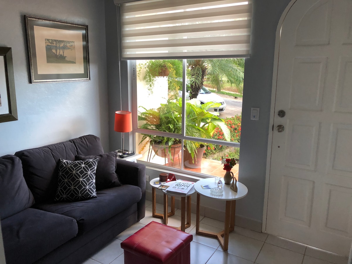 We are officially open! We would like to welcome you to a hospitable, quaint, and warm space we have built for our guests. We are conveniently located 5 minutes from the International Airport, in a safe and clean community. The community is in walking distance to market stores, pharmacy, bakeries, and restaurants. We look forward to hosting you. ¡Estamos oficialmente abiertos! Le damos la bienvenida a un espacio acogedor, pintoresco y cálido que hemos construido para nuestros huéspedes.