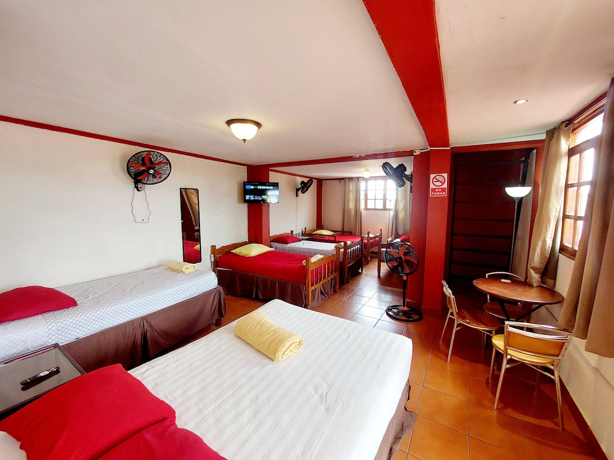 🌿 Habitación privada muy amplia, ideal para familias o grupos de hasta 7 personas. Tiene una cama matrimonial y cinco camas individuales, Smart TV, Ventiladores de pared , Wi-Fi y baño privado. ❄️ Aire acondicionado disponible con costo adicional. ( opcional) Ubicada en el tercer piso. Espaciosa, con excelente iluminación natural y estilo colonial sencillo. A 4 calles del Parque Central. Estacionamiento seguro disponible cerca con costo extra. !Conocé Granada con comodidad y autenticidad!