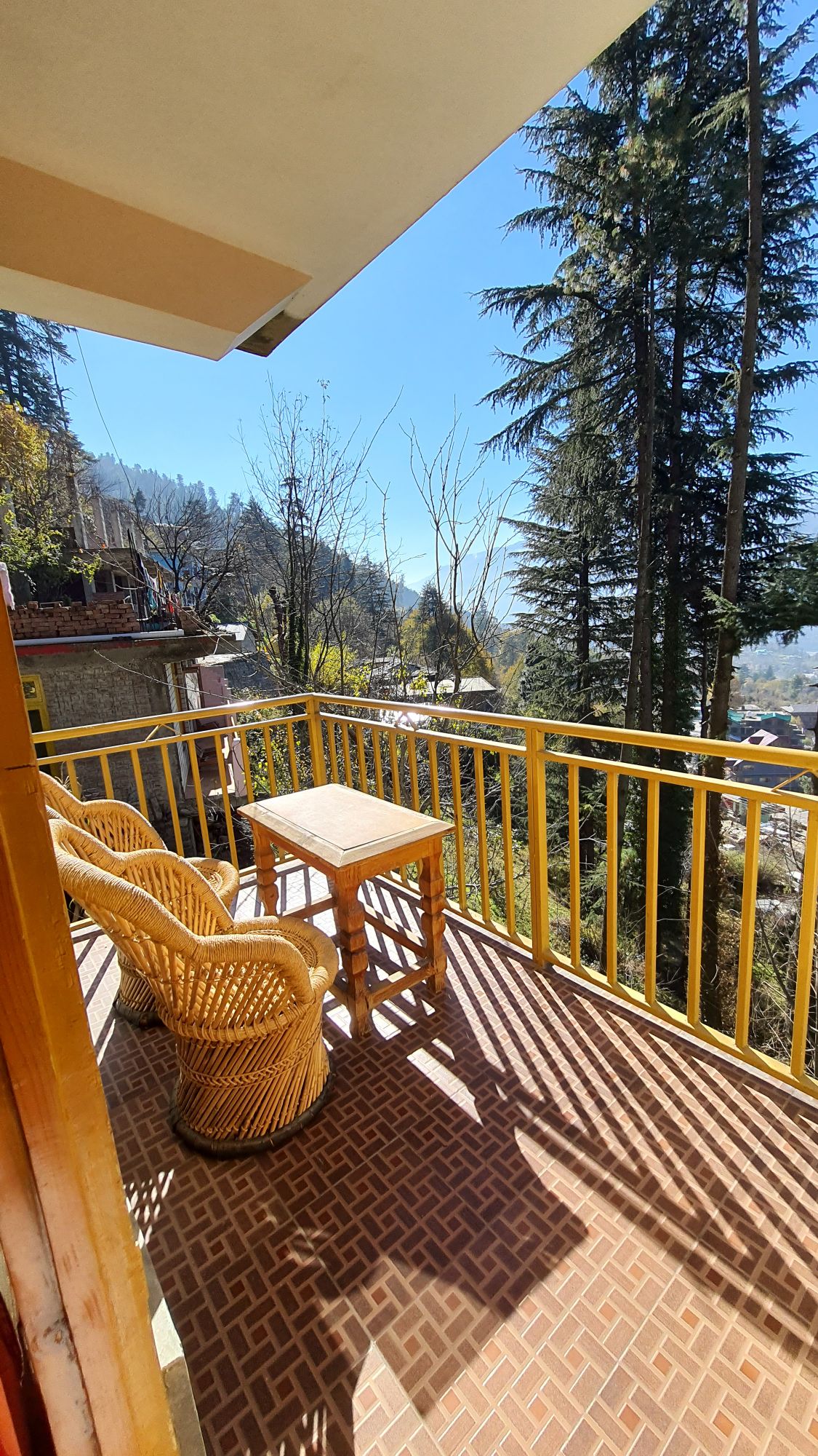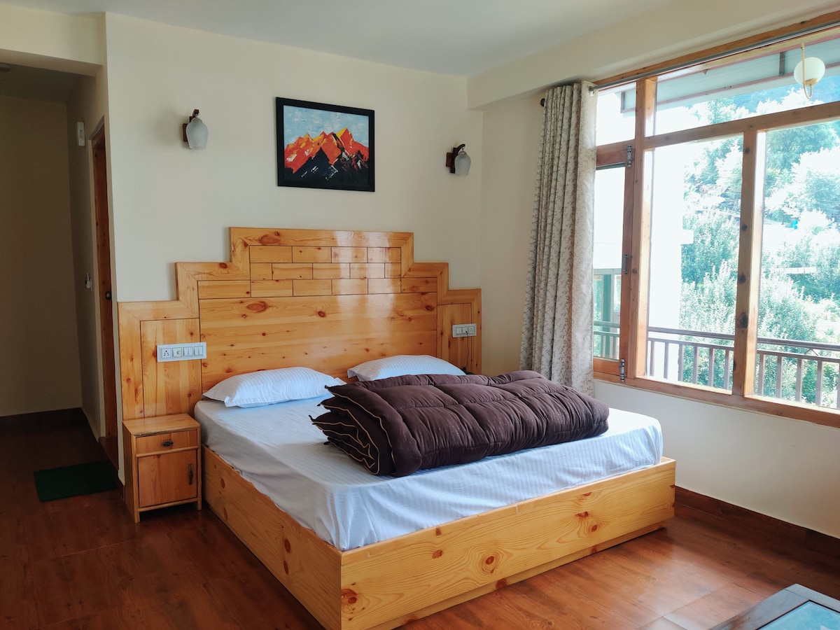 Property Name: The Panorama Retreat, Manali Centrally located | Just 10 mins/1.5 kms drive to Mall Road "Panoramic Mountain View" Room Located on Second Floor | Complimentary Breakfast | Mountain View | Attached Balcony | Complimentary Room Heater | Complimentary Bed Warmer | Alpine Grade Duvet | Very Comfortable Bedding | Attached Washroom | Onsite Free Parking | Spacious | Timeless Interiors | 43 inch Smart TV | Tea & Coffee Amenities | Kettle | Professionally Cleaned | Hygienic | Hot Water