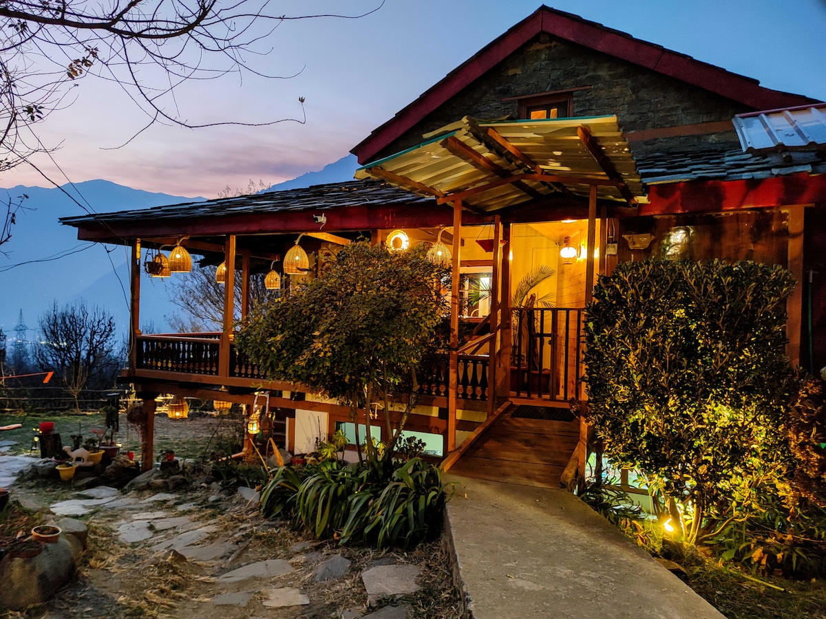 Freshly renovated! We just completed a full cottage makeover on October 20, 2025, In an elegant Manali neighborhood, 5 mins walk to Mall Road, is placed this exclusive hill cottage with fascinating interiors and stupendous views of Manali hills. A typical hill cottage is the epitome of luxurious living with style decor. A trained cook and caretaker are on-site for your assistance. Stay at our heritage 2BHK with a wooden fireplace and an open area to walk and feel lively.