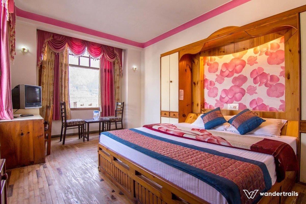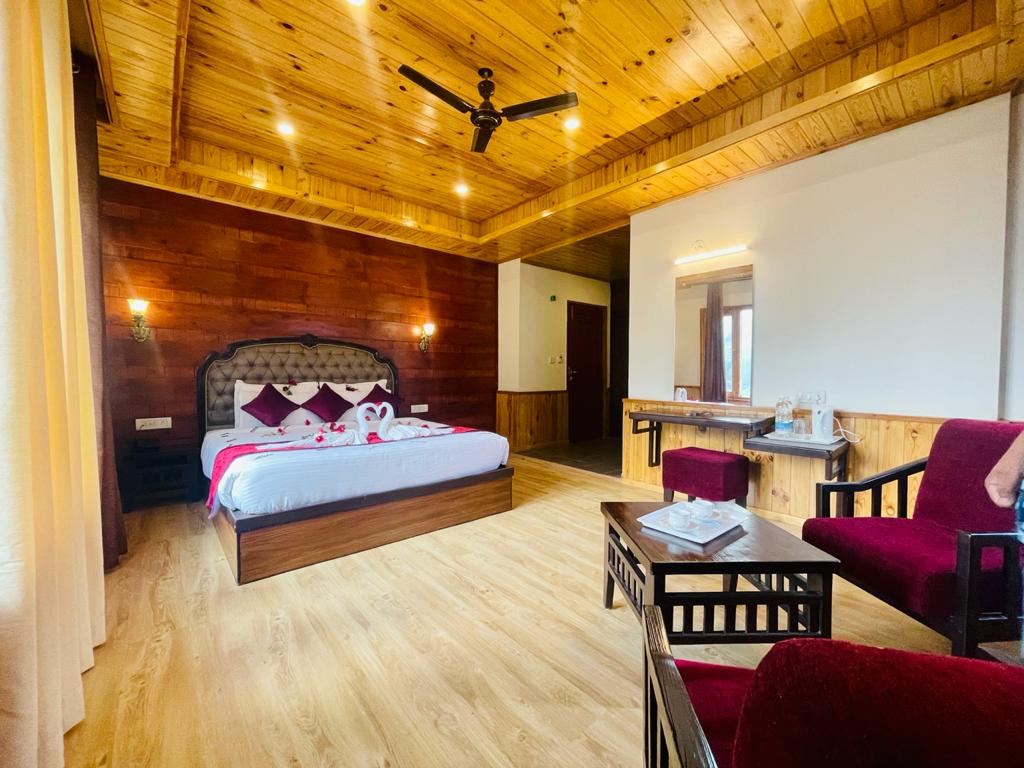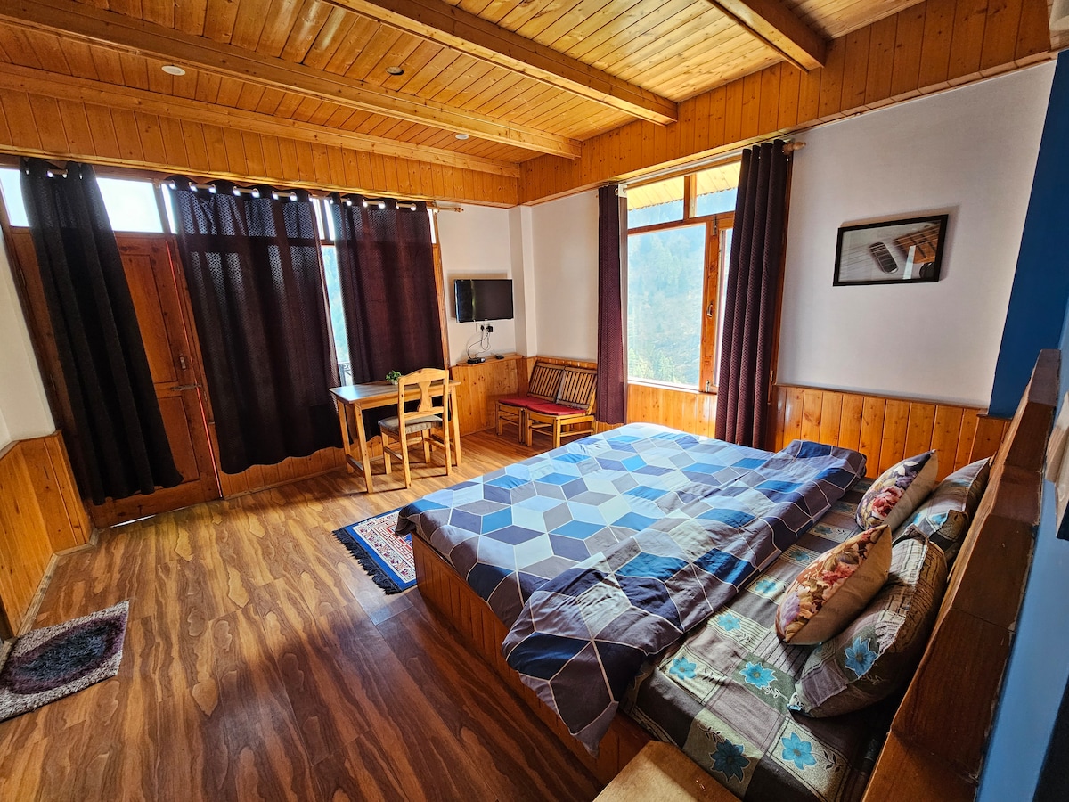 Super cozy Duplex Suite WITH WINDOWS for mountain view. One bedroom on lower level with one washroom and a wooden stairs to upper level bedroom. it has a sofa set on upper level where 4-5 guest can sit and enjoy food. ROOM INCLUSIONS : -Comp Mineral water on arrival -Free WI-FI , parking Free Breakfast (Morning 8.30 till 10.30am)served at dining area only (No Room Service) -Heater at additional 300/- rs charge Room is on 3rd Floor Note *No provision of lift*